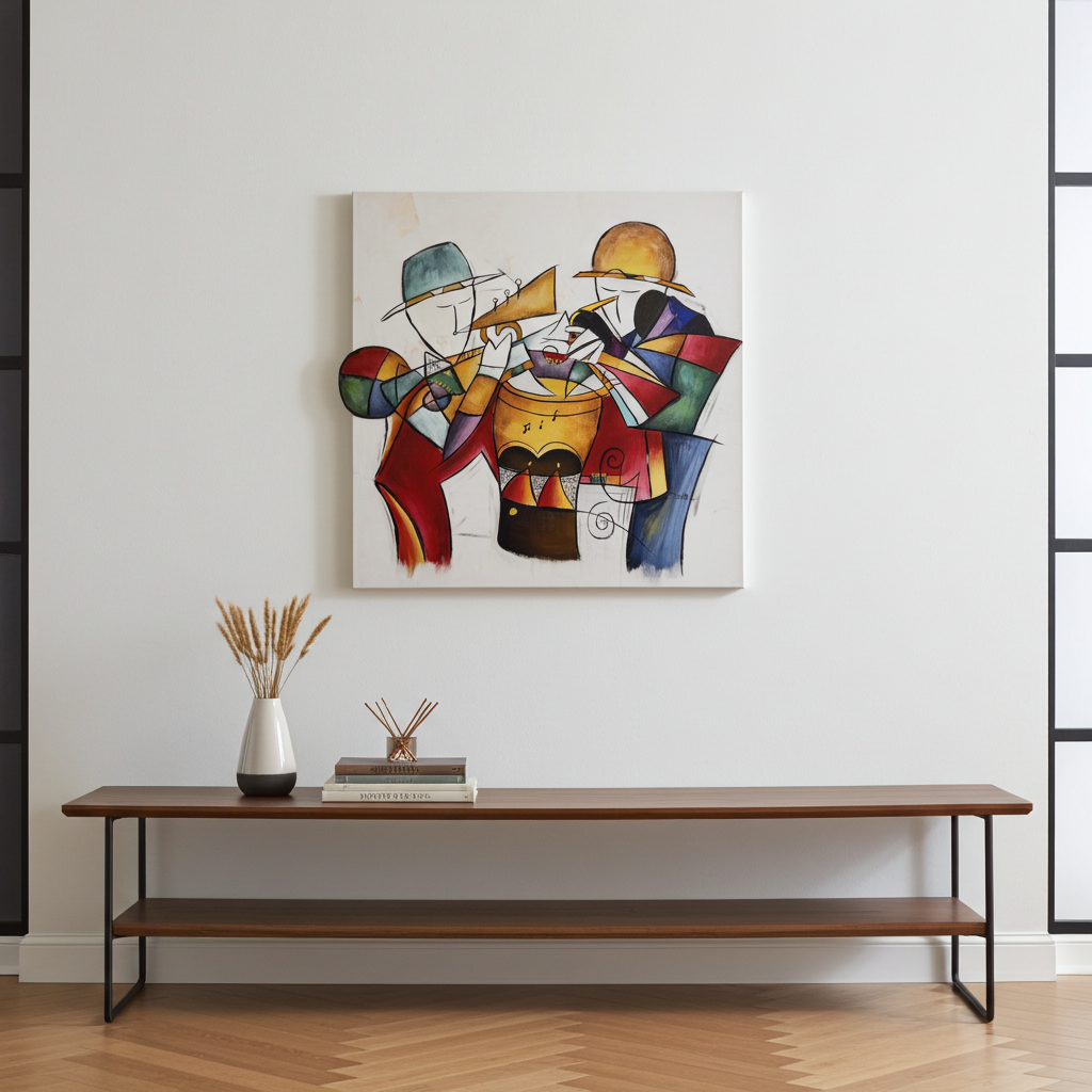 Ein lebendiges abstraktes Gemälde mit drei stilisierten Musikern im modernen Kubismus. Kräftige geometrische Formen, leuchtende Farbflächen und ausdrucksstarke Linienführung schaffen eine dynamische Komposition voller Rhythmus und Bewegung. Das Gemälde verbindet musikalische Motive mit zeitgenössischer abstrakter Gestaltung und verleiht ihm so einen verspielten und zugleich raffinierten Charakter. Handgemalt auf echter Leinwand, machen die vielschichtigen Texturen und dynamischen Formen es zu einem faszinierenden Blickfang in jedem Raum.