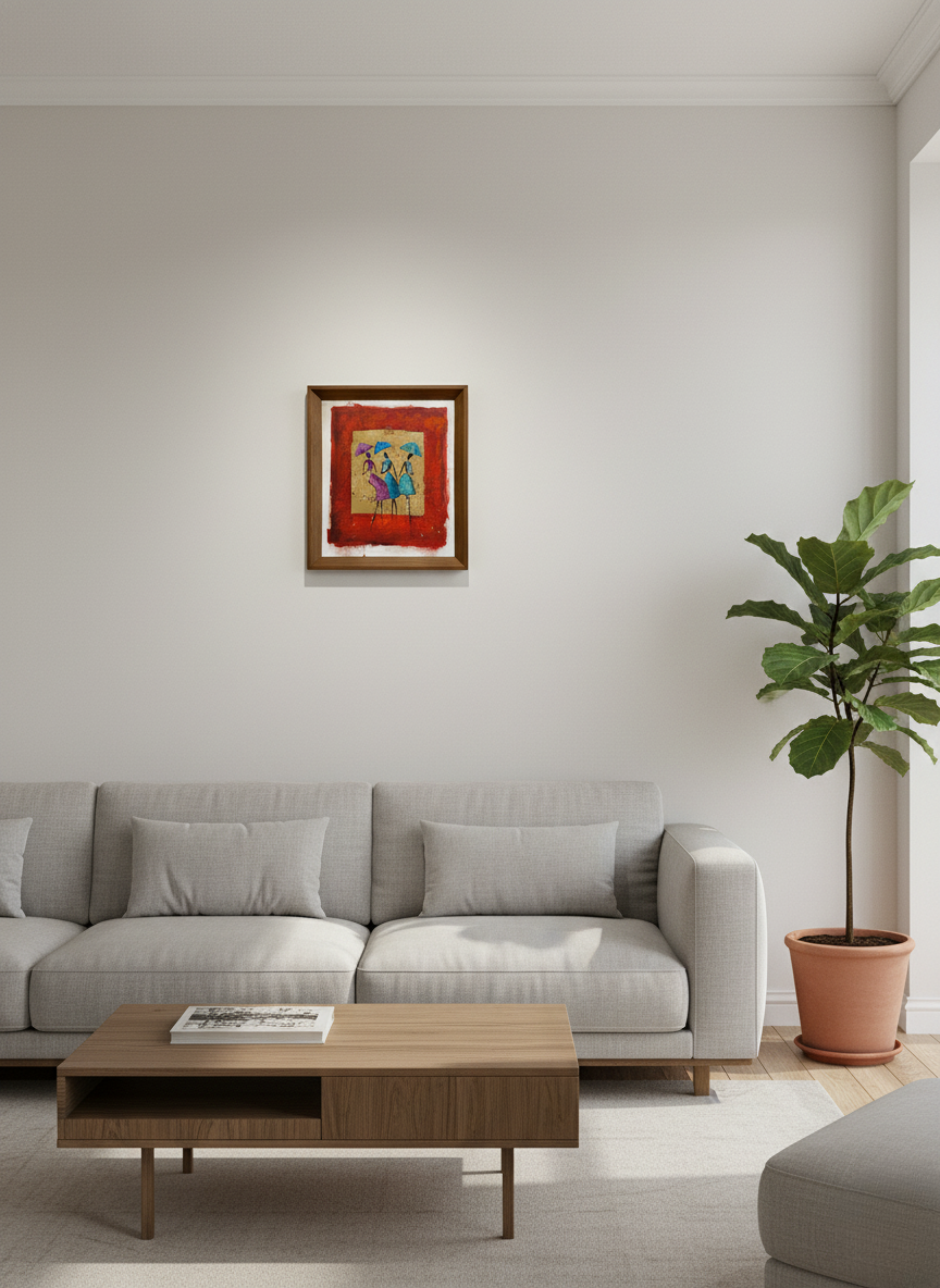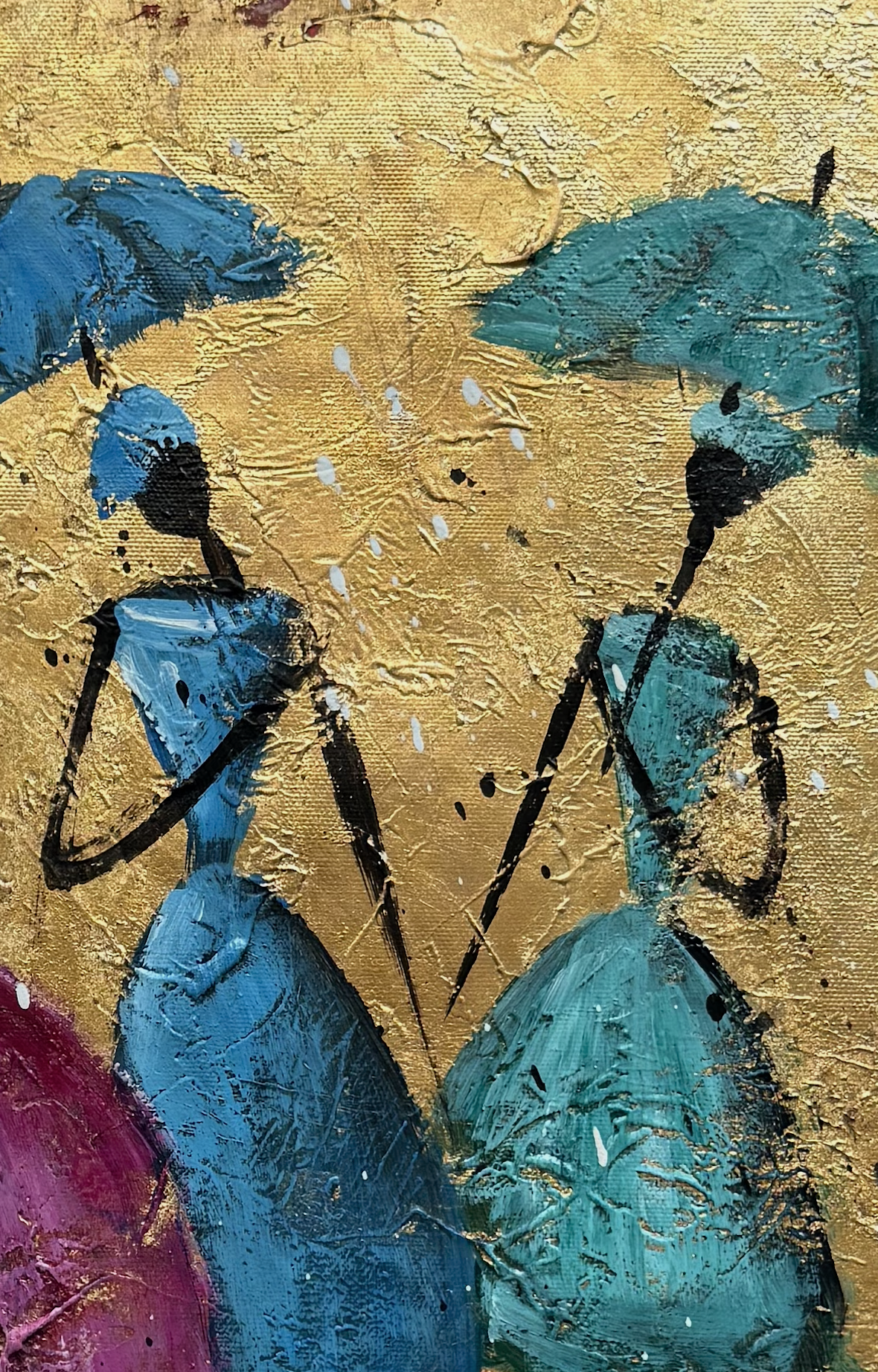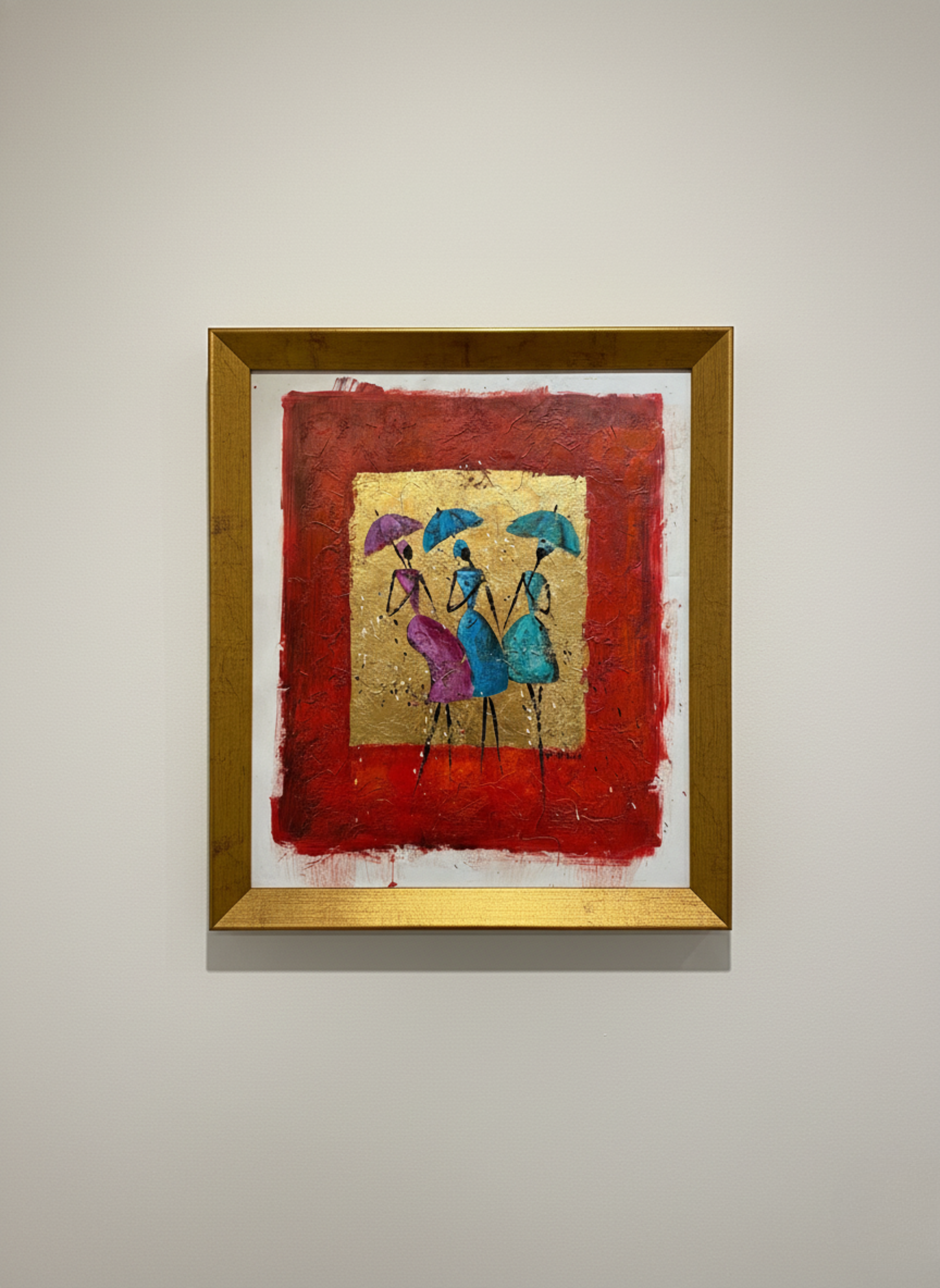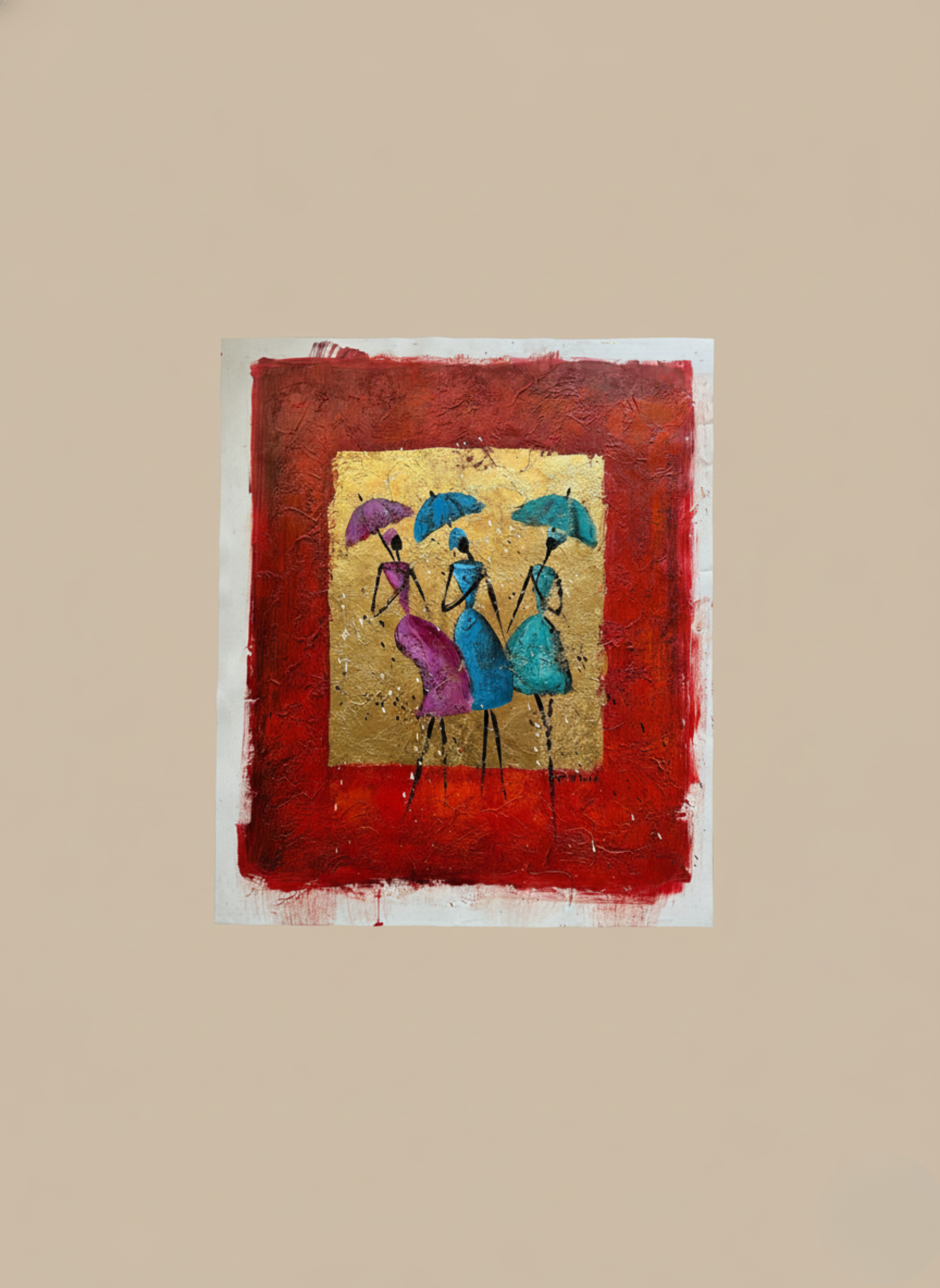 Une peinture abstraite texturée représentant trois figures stylisées tenant des parapluies, se détachant sur un panneau central doré encadré d'une large bordure rouge. La texture au couteau à palette crée profondeur et dimension, tandis que le contraste audacieux des couleurs confère à l'œuvre une présence contemporaine affirmée. Les silhouettes simplifiées privilégient la forme, le rythme et la couleur au réalisme, rendant la composition à la fois saisissante et équilibrée.