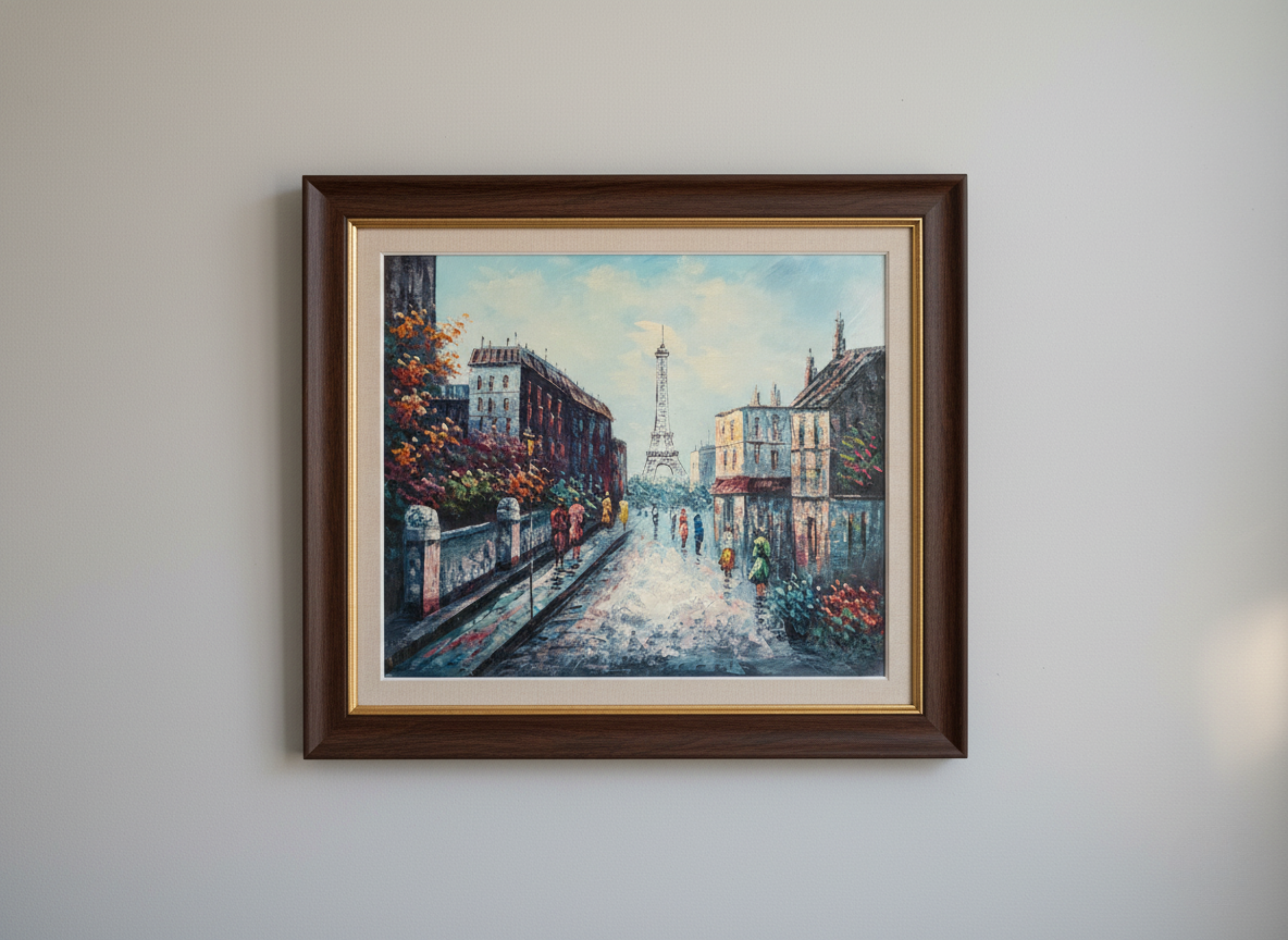 A hand-painted impressionist cityscape featuring a Paris boulevard leading toward the Eiffel Tower. Created with bold palette-knife strokes, this painting has rich texture throughout the buildings, figures, and reflections, giving the scene an atmospheric sense of depth and movement. Warm sunset tones blend into cooler shadows along the street, capturing the charm and energy of an evening walk through Paris. Painted on real canvas, it brings a timeless European elegance and a touch of romance into any interior.